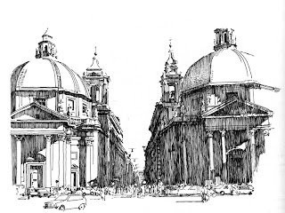 A map helps inform us of the area of exploration seen from above, but the human experience is detailed through the perspective view, on eye level. We take pictures with perspective views of the world all the time. There are also different point of view where one can capture an image such as worm's eye view, a shot taken nearly from the ground. in this position, our views are E-W directional vs. the N-S views of the plan. We interchange between these two views, the plan(encompassed approach) and the perspective(intimate approach) to communicate the idea of place, i.e. a pedestrian street, a piazza, a busy downtown, to complete a visual idea of place, and human connection to place.